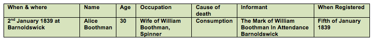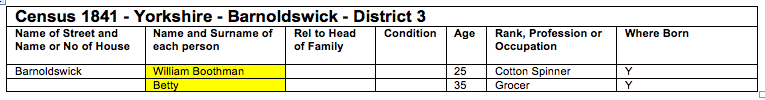 However the fact that Betty’s occupation is given as ‘Mule Spinner’ on her marriage certificate in 1840 and yet ‘Grocer’ in the 1841 census does suggest that she may have inherited the shop in the intervening period. There is a John King death in Skipton in 1841, which could fit with this idea. I cannot find a Mary King death but she might well have died before 1837. I can however, find no probate record to support this theory and the MC (for William Silverwood and Betty) does not indicate that John King is deceased so this is rather a long shot.