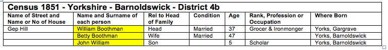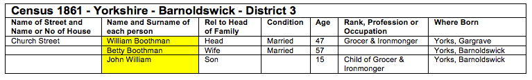 The first official record in the Boothman line is thus the 1840 marriage of William Silverwood Boothman and Betty King. However, some inferences can be made (direct line ancestors shown in yellow).