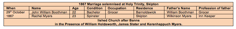 married Rachel Myers in Skipton on 29th October 1867. Ancestry details for Rachel Myers are given in the separate Myers line.