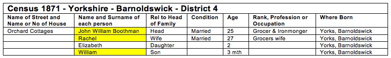 In 1871 John William and Rachel were living in Orchard Cottages, Barnoldswick with their 2 children.