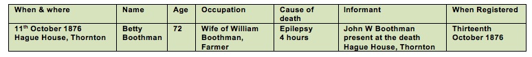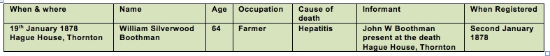 It seems quite likely that the Boothmans - John William & Rachel and children and also grandparents William Silverwood & Betty - moved into Hague House as soon as the lease was released in 1876. The births of the children (see p 12) show that John William & Rachel were not there in January 1876 when Fred was born but they were there in October 1876 when Betty died and for the birth of their next child Joseph in December 1877.