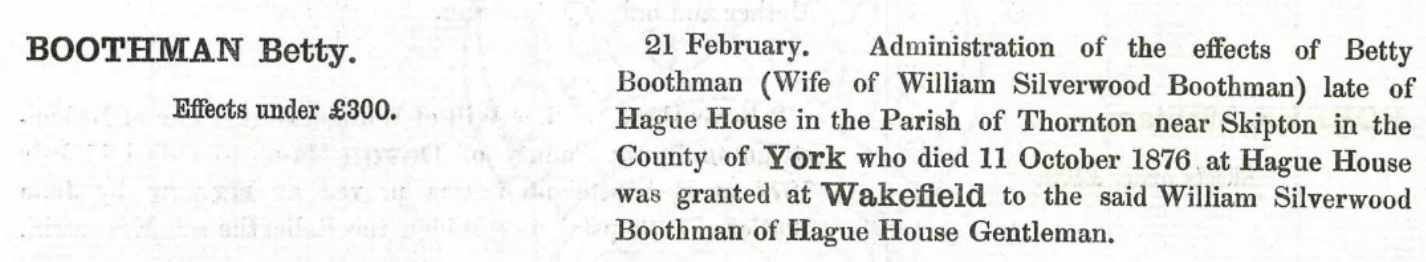 The birth record of William Silverwood Boothman (from Family Search) - 9th January 1814 in Kirkby Malham, Yorkshire - records only his mother’s name. This is unusual - more commonly there are no names, both parents’ names or the name of the father only. Also the marriage certificate of William Silverwood and Betty King gives her father’s name and profession (as expected) but there is no entry for the name and profession of his father.