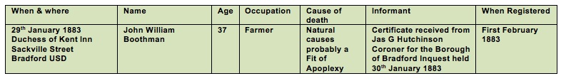 The death certificate shows that John William died from a ‘fit of apoplexy’ - which today would be describes as a ‘stroke’. One wonders what he was doing in the Duchess of Kent Inn in Bradford that gave him a stroke!!!