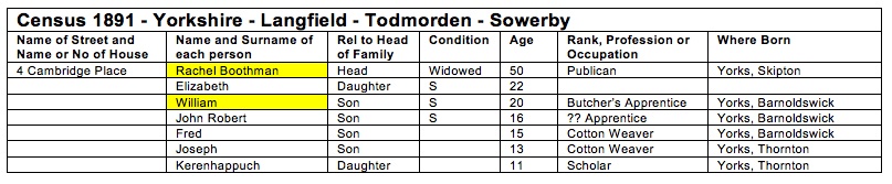 By 1891 most of the children were old enough to be earning too but there were probably a few hard years after John William’s death. Although she is listed as a ‘Publican’ Rachel and family are clearly not living at the pub itself but at 4 Cambridge Place in Todmorden.