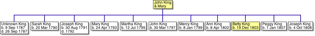 The Family Search record overleaf lists Betty’s parents as John King and Mary. I cannot find any sign of them in the 1841 census. The names are too common for a search to have much chance of success.
