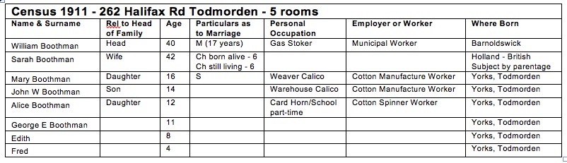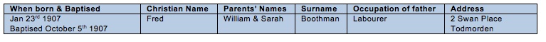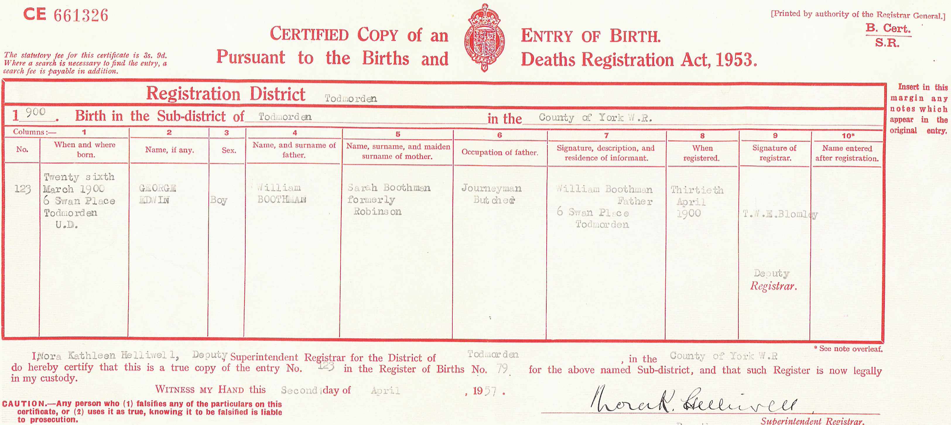 George Edwin Boothman was born on 26th March 1900, the third of six children of William Boothman and his wife Sarah. William was a butcher in the Yorkshire town of Todmorden and the family lived at 6 Swan Place. For the history of the Boothman line before 1900 see the Boothman Line.
