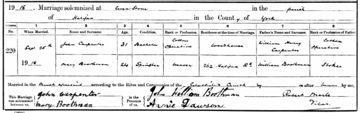 This record of the marriage comes from the Ancestry website - West Yorkshire, England, Marriages and Banns