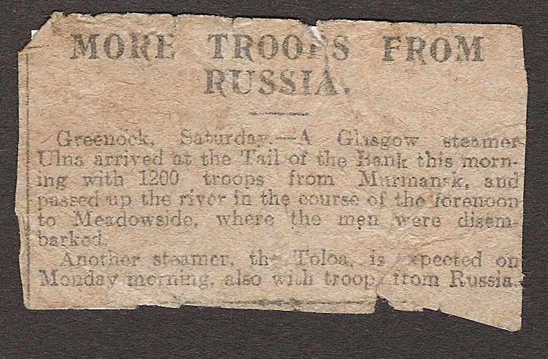 Finally on October 3rd we embarked on the S.S. Ulna at Murmansk and after a very rough voyage we arrived at Glasgow. We then entrained for Shorncliffe where we were put in a rest camp, cleaned up, given new clothes and sent on two months leave.Press cutting tells of the arrival of the Ulna.