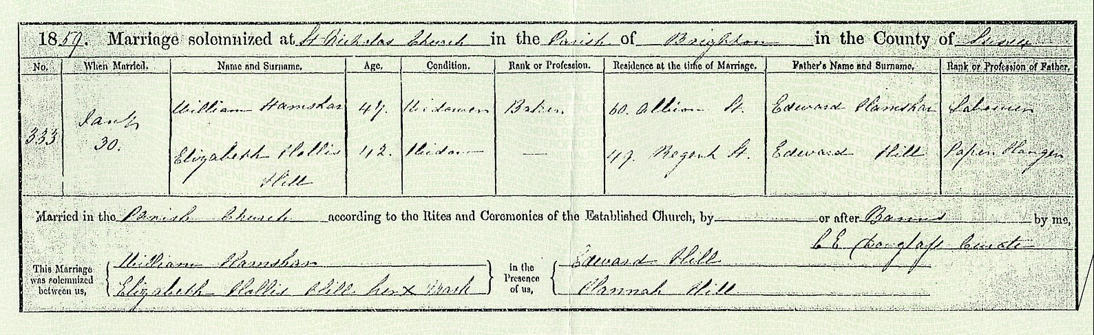However, a marriage certificate for William Hamshar & Ann Guilford cannot be traced. There is a marriage certificate for William Hamshar and Ann Lush who were married in the Parish Church Preston (Brighton outskirts) on 23rd October 1842, which would seem to fit as everything tallies with the later 1859 marriage certificate for William Hamshar and Elizabeth Collis-Hill, his second wife. Perhaps Ann was married briefly to Mr Lush, although the marriage certificate has her as ‘spinster’?