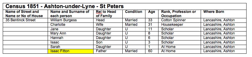 In 1841 Isaac Fitton was living in Ashton-under-Lyne with his wife Mary and 4 children. The quality of the original document is too poor to read so this information relies on the transcript, which is only partial. I cannot determine a street address nor any entries in the Profession column.