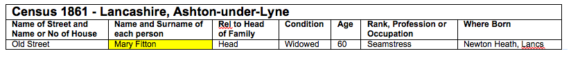 In 1861 the widowed Mary is living alone in Old Street, Ashton. The age fits and the place of birth - Newton Heath - coincides with that recorded in the 1851 census so this is very probably our Mary.