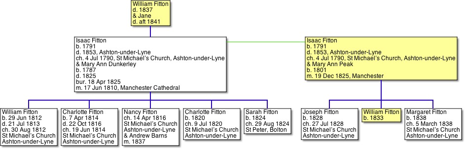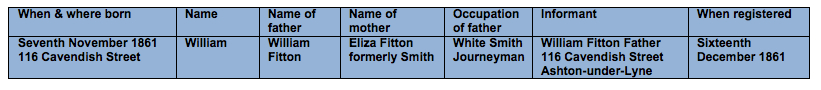 Ashton-under-Lyne and parents’ names are given as William Fitton and Jane. I have found a number of William