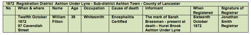 2William Fitton died of encephalitis in 1872 at the tender age of 39. (His son, 3William, would also die very young - 44 - see Bertha’s Story 1905. However the causes of death were very different.)