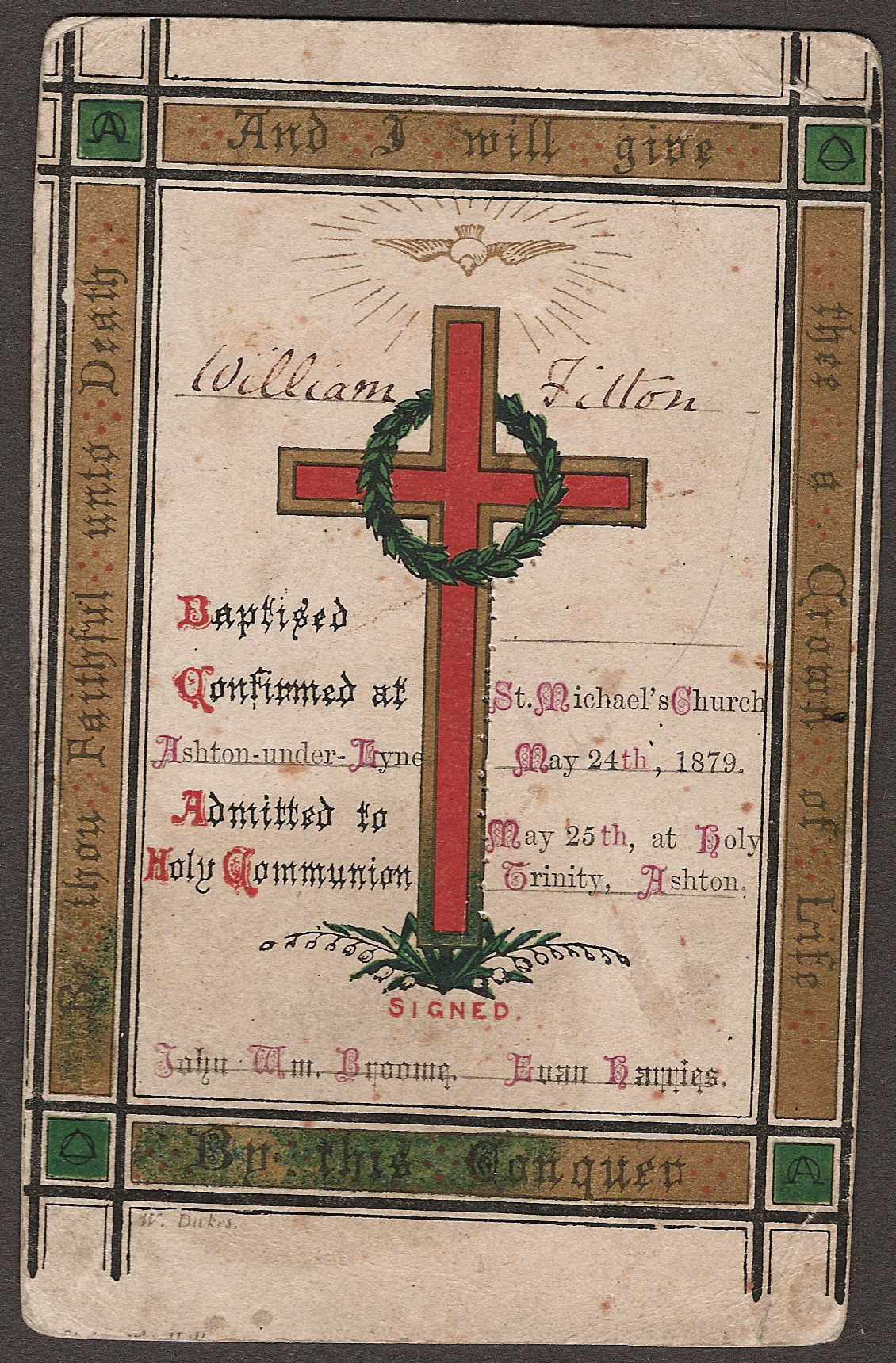 This card commemorating 3William Fitton’s Confirmation is on of the oldest original documents in the 20 Century Diary. It came from Bertha and Edwin’s collection of photographs etc, kept in an old tin and passed down to me. This confirmation is very late by modern standards as William would have been 18 at the time.