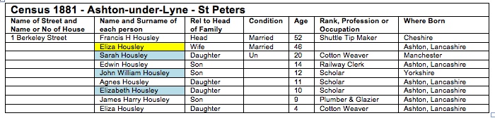 The reason that the family initially proved impossible to find in the 1881 census is that the census enumerator did not appreciate that Edwin, Agnes and James were stepchildren and gave them all the Housley name. To be fair the family was rather complicated with all the children shaded blue below being children from Frank Housleys’ previous marriage.