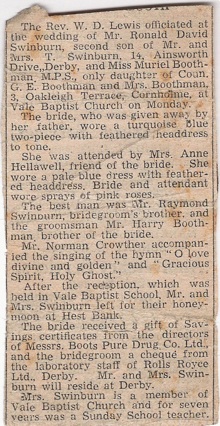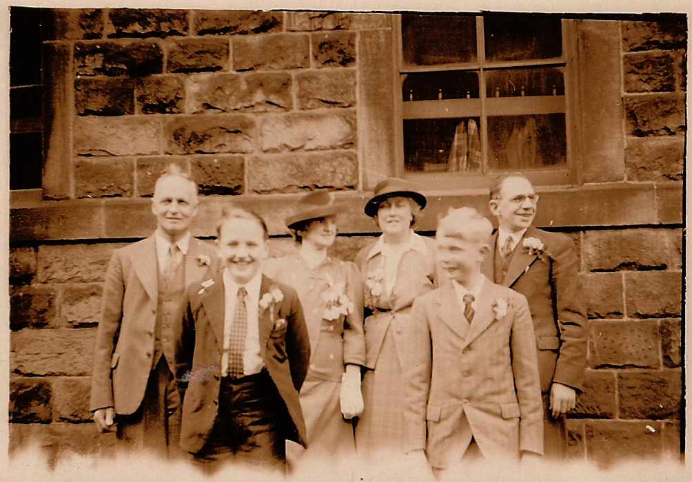 The photograph above shows (l to r) Edwin & Bertha Boothman (Muriel's parents), Anne Hellawell (bridesmaid), Dave & Muriel, Ray Swinburn (brother to Dave and Best Man) Margaret-May and Tom Swinburn (Dave's parents).