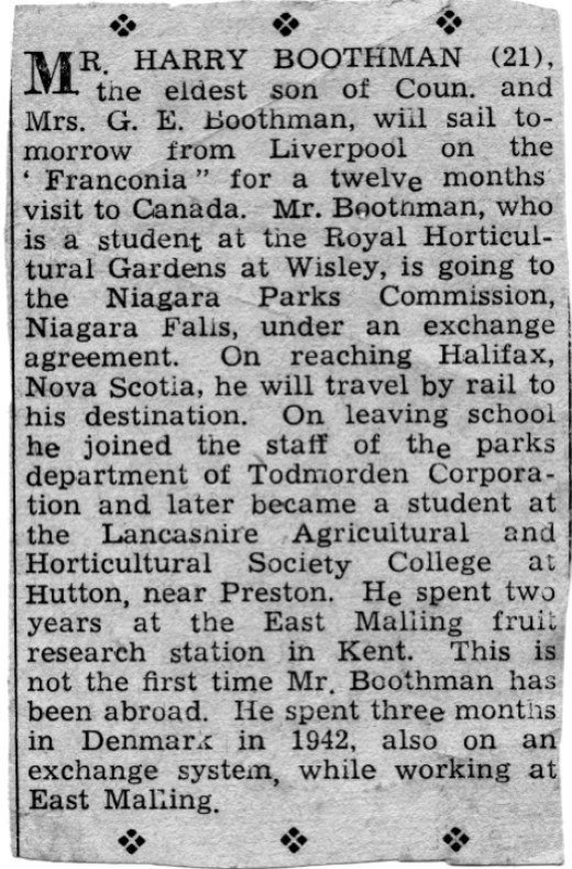 Harry was in Canada on a twelve months exchange from the Royal Horticultural Gardens at Wisley to Niagara Parks Commission in Niagara Falls.