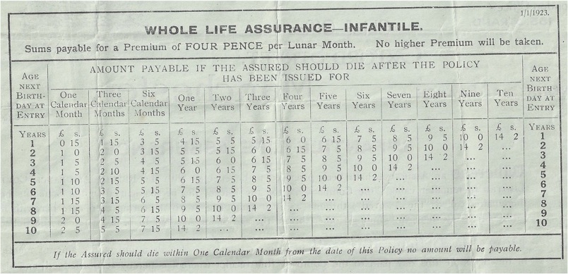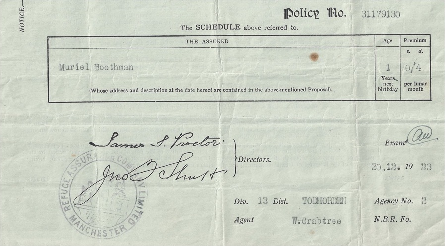 An Infantile Life Insurance Policy was taken out for Muriel on 20/12/1923 with the Refuse Assurance Company. Payments were 4 pence per month and the amount payable on death was on a scale shown on the chart below. Clearly cover lasted only until the child was 10 years old.