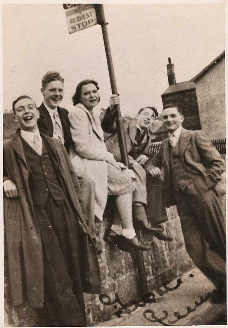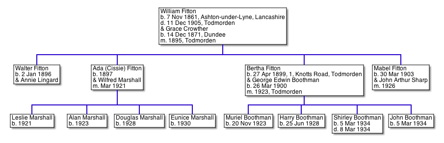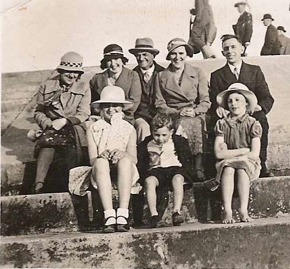 The snap below taken in the street on the day of Edith and Willie’s wedding shows all the ladies & children (from left to right) Bertha's sister, Cissie Marshall with her son Alan, Bertha with Muriel, my sister, Mary Carpenter with her daughter Alice and Edith Boothman (nee Cunliffe), wife of my brother Jack, with her son, Alan.