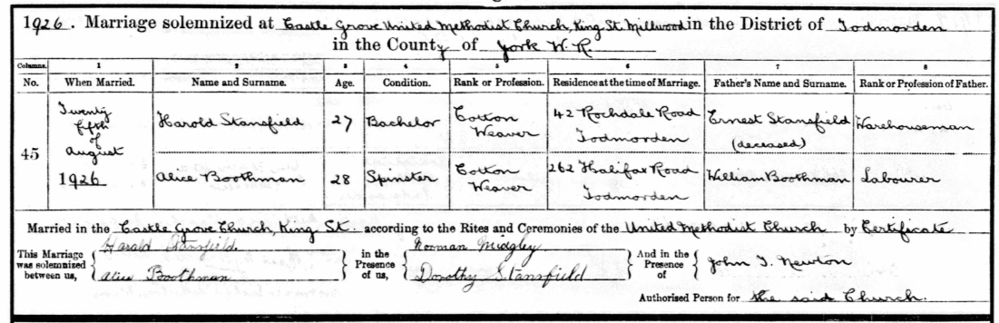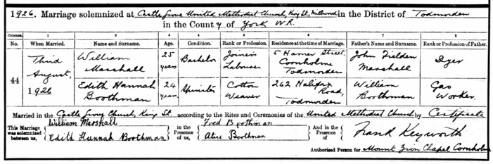 The record of this marriage below comes from the records of West Yorkshire, England, Marriages and Banns found through Ancestry.co.uk. It is amongst the listing for St Michael and All Angels in Cornholme and gives the dates of the banns and the marriage..