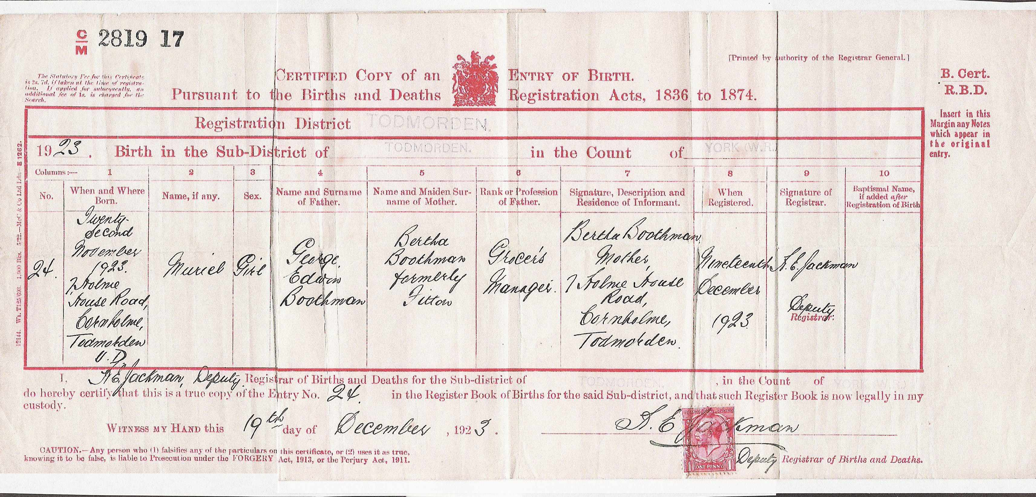 22nd November 1923 - Bertha (24) - Birth of Muriel