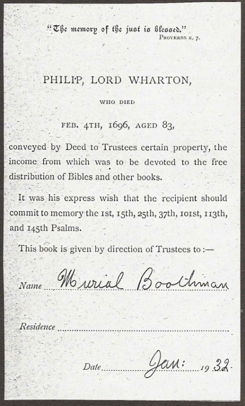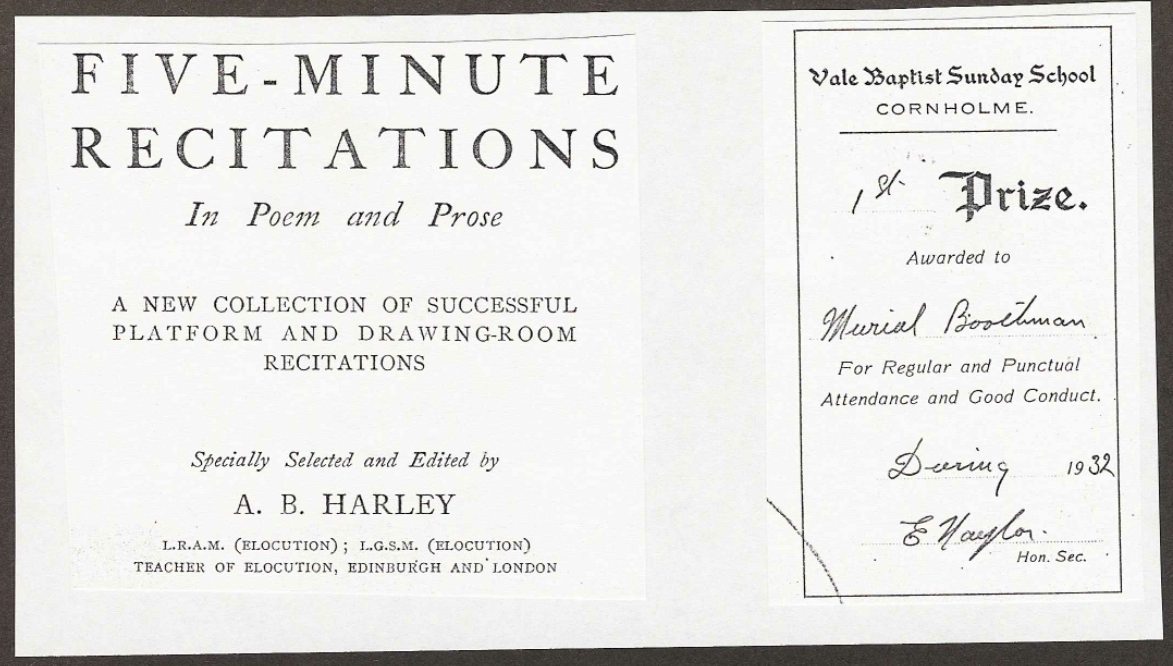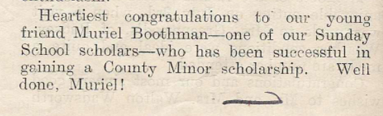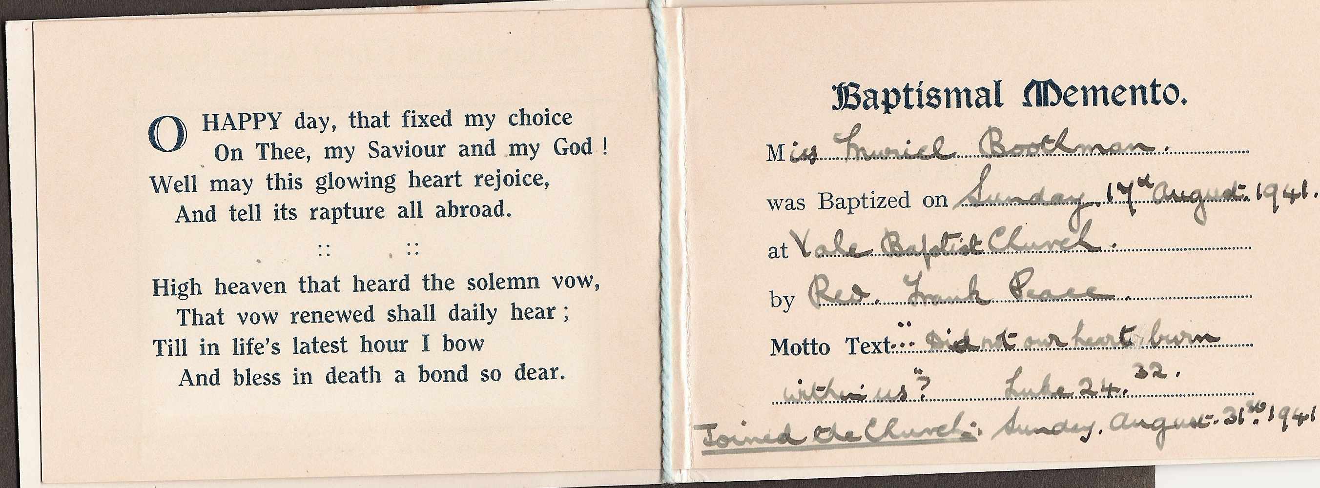 During her teens Muriel was an ardent Baptist, being baptised at the age of 17 by full immersion. For some years she taught at the local Sunday School, following in the footsteps of her father who was also a Sunday School teacher.