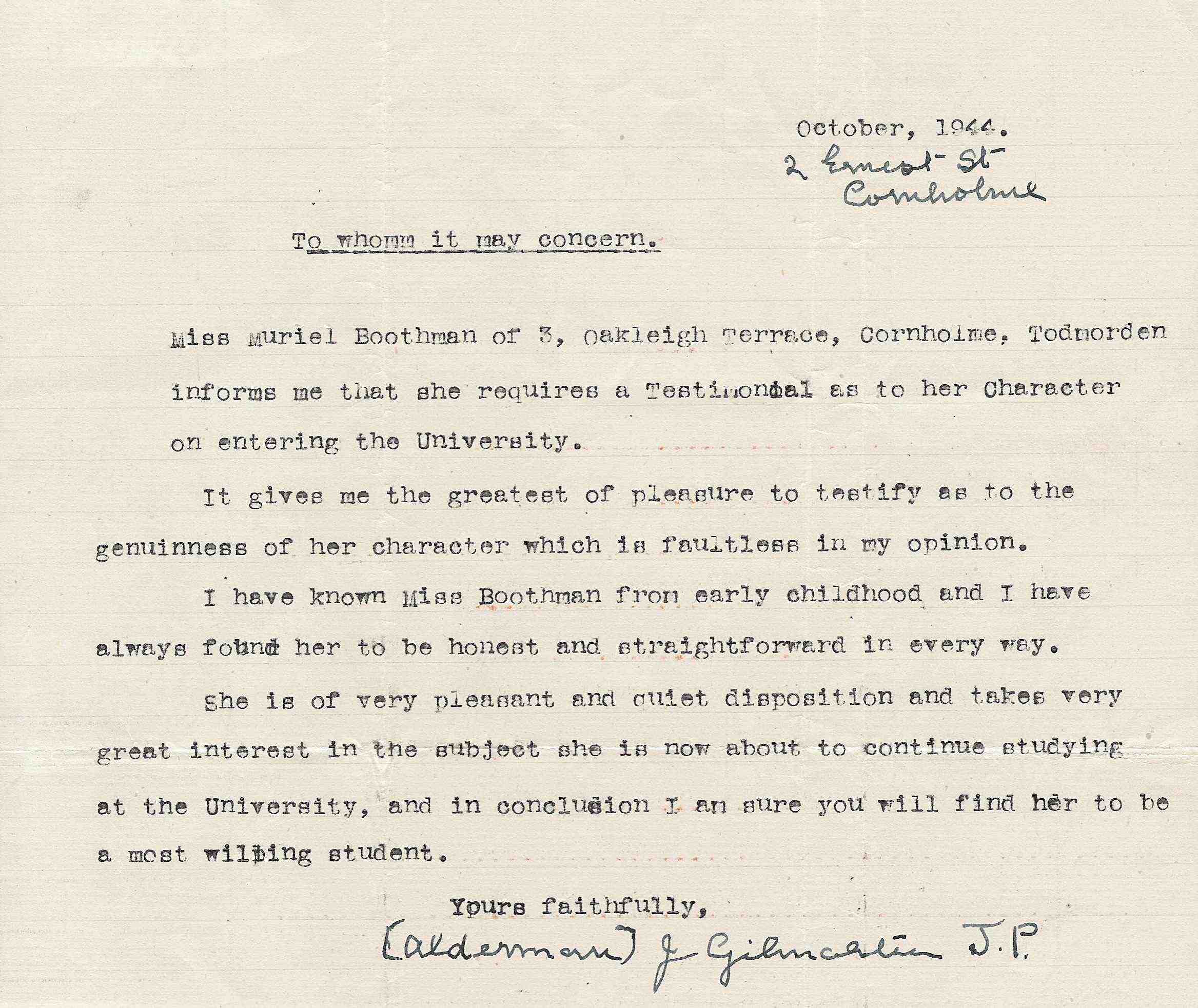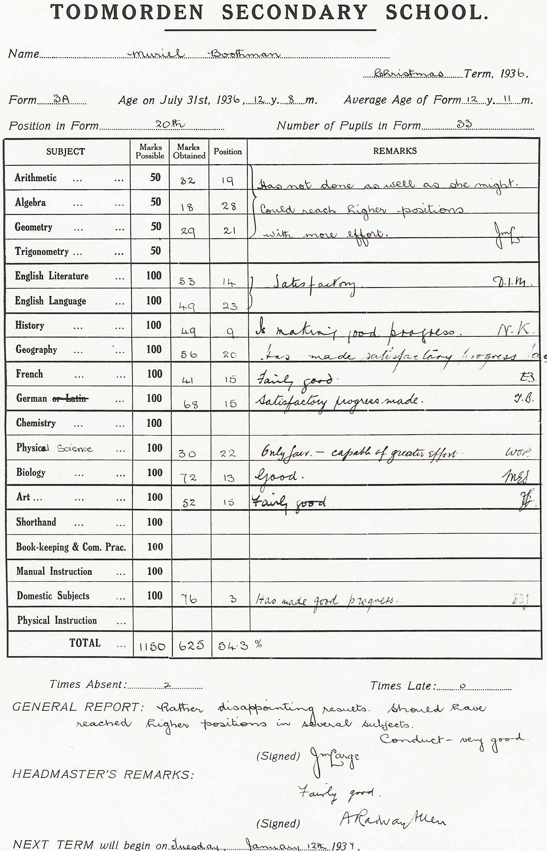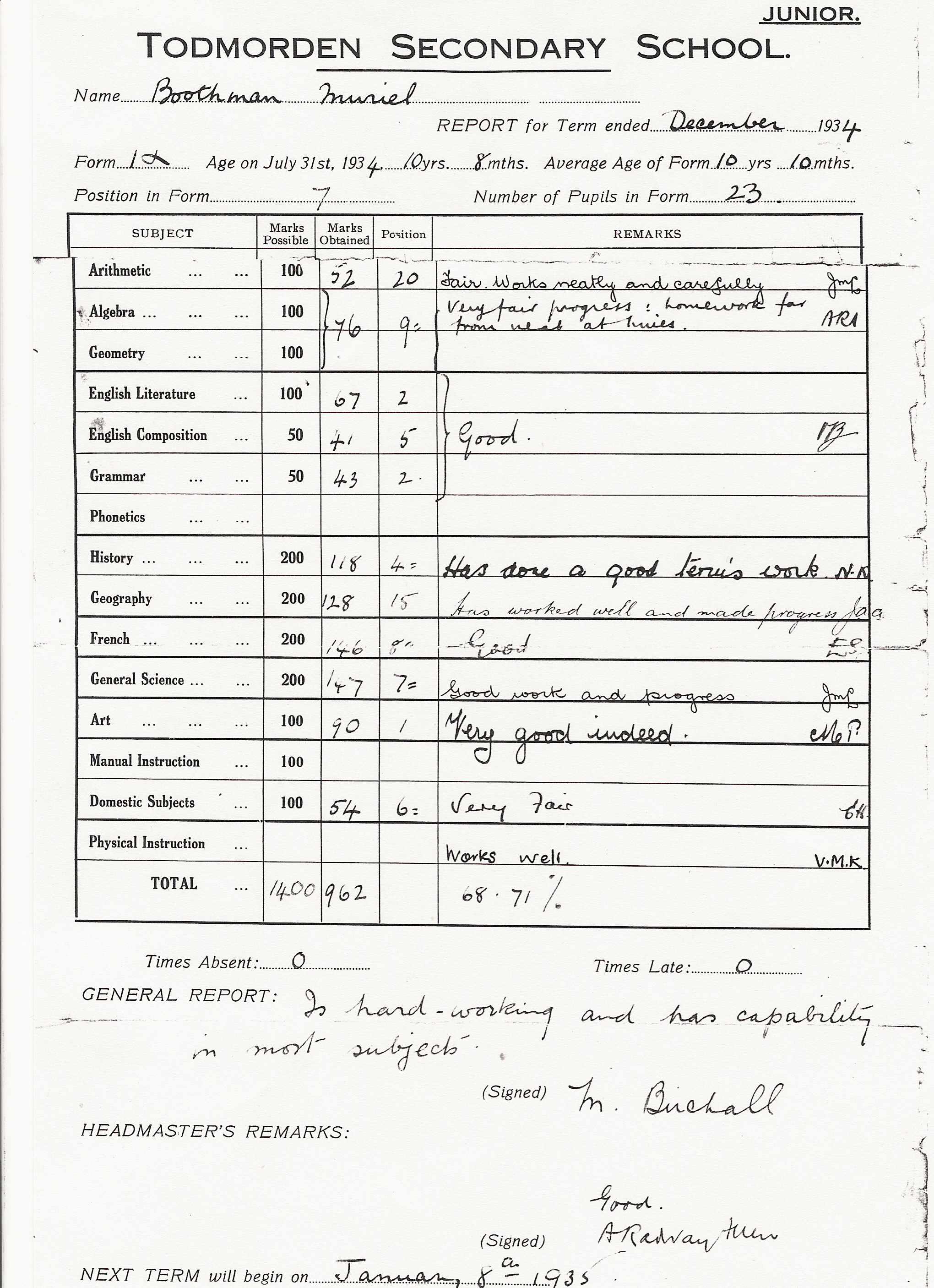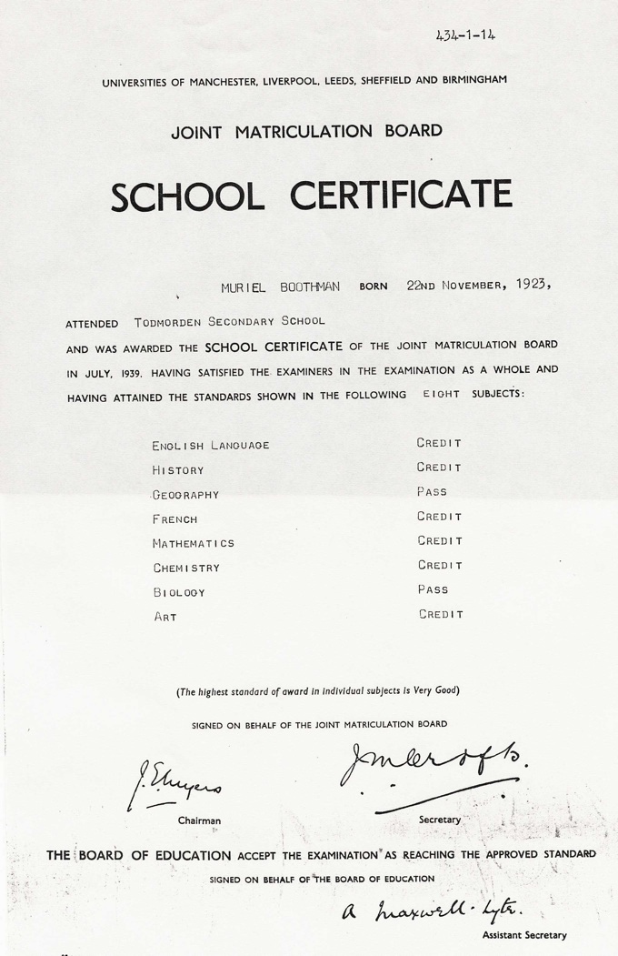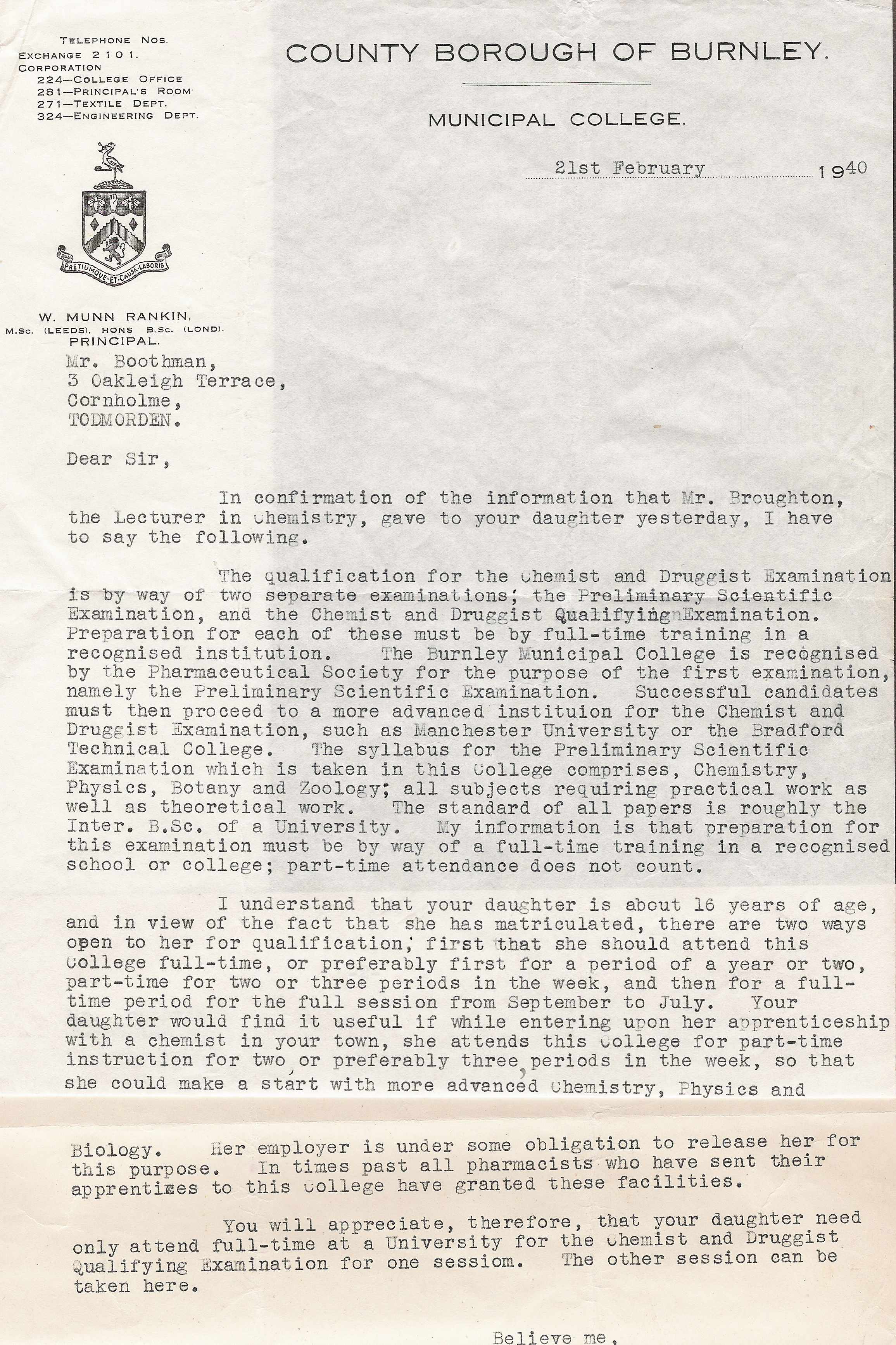 Born Muriel Boothman in 1923, she was the eldest child of Edwin and Bertha. Their home was in Cornholme a small village near Todmorden, on the Lancashire/Yorkshire border. Muriel attended the village school and at the age of 11 passed the County Minor Scholarship to gain a place at Todmorden Secondary School where she proved an able student. On leaving school at 15, Muriel was encouraged by her father to become an apprentice pharmacist with Boots. This involved three years’ work in Boots chemists in Todmorden with day release time, followed by a year of full time study at Burnley Municipal College and a further year full time at Manchester University.