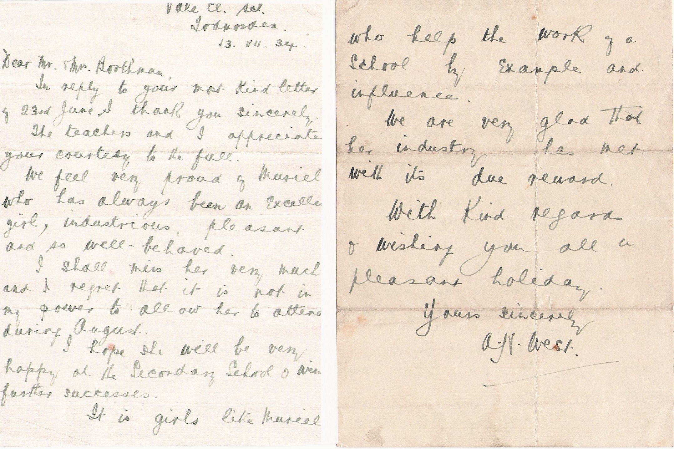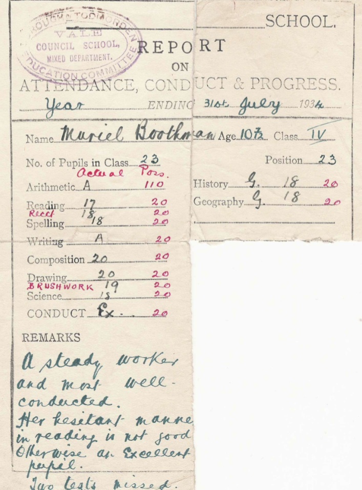 This was the 'Babies Class', Muriel remembers. The teacher, Miss Barker, made every child a cup of Horlicks at break time (presumably she paid for it herself). Muriel remembers her telling them stories eg Little Black Sambo.