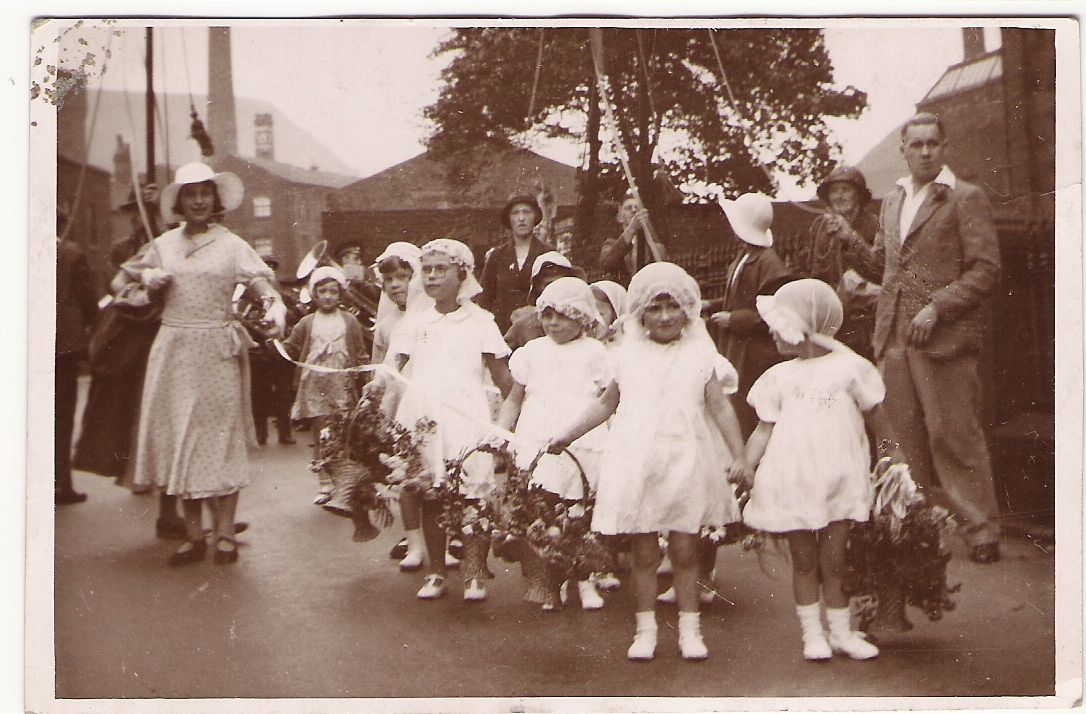 The picture of all the children below this on the right was clearly taken on the same occasion and shows the cousins Muriel (centre front) Alice (back), Alan Boothman (left) and Alan Marshall (right). The picture on the left is a studio portrait but shows Muriel with the same clothes and hairstyle. In 2014 Muriel's cousin, Alice remembered the dress - "In those days our mums bought the fabric and there were some very talented dressmakers in Tod." It is unlikely that Bertha made the dress though as she was not particularly talented in that direction - it was probably made by one of the aunties.