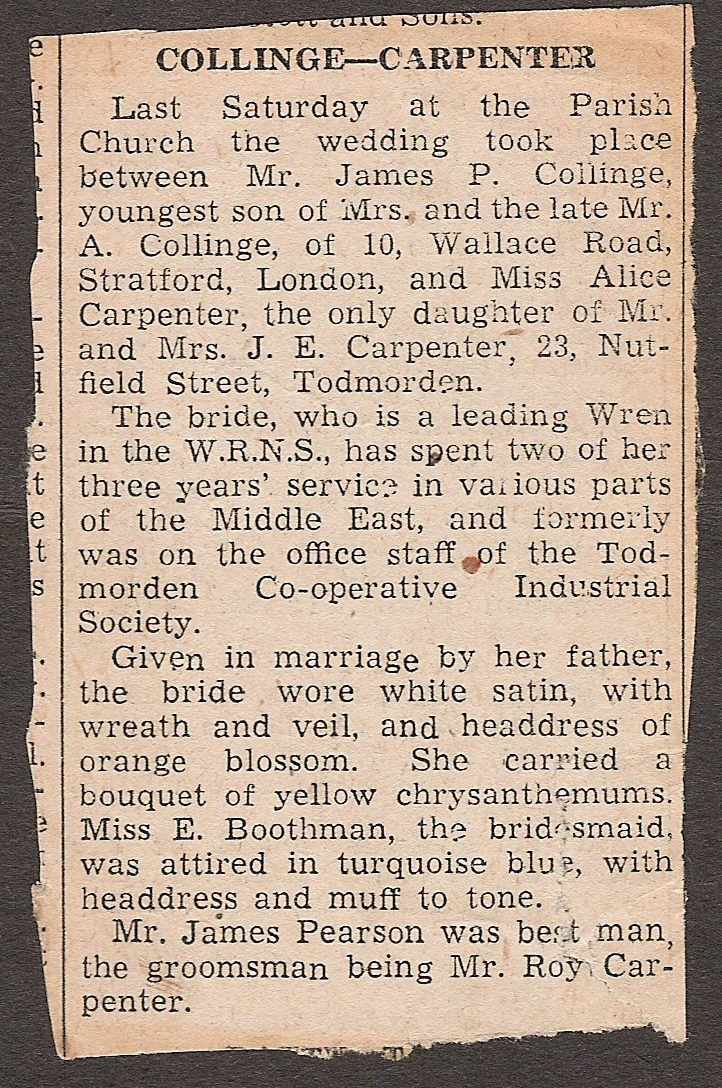 Alice remembers joining Muriel and Dave in Cornholme for a Christmas party before leaving Tod on Christmas Eve to join Jim’s Mum in London. Every Christmas there was a party in Cornholme with a new game each time along with the family favourites. The press cutting has the wrong name – Collinge – presumably a mishearing.