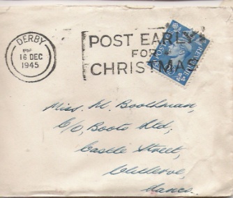 This envelope addressed to Muriel at Boots in Clitheroe was amongst 40 envelopes that had contained love letters between Dave and Muriel between July 1945 and May 1946. After their 50th Wedding Anniversary D&M destroyed the actual letters feeling that they were too personal to ever be read by anyone else. However they kept the envelopes until their deaths.