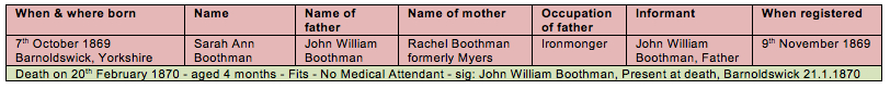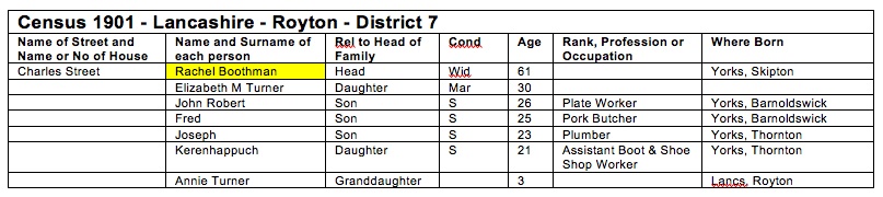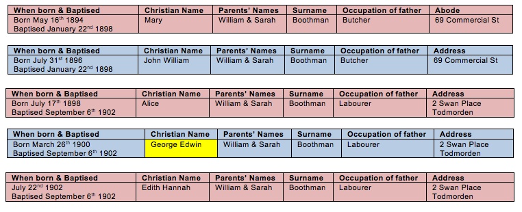 For details of this and the continuing story see Edwin's Story - this covers the life of George Edwin Boothman, including 1901 and 1911 census details for him and for William & Sarah and Rachel - also the death of Rachel in 1924.