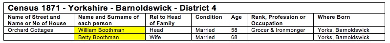 In 1871 John William and Rachel were living in Orchard Cottages, Barnoldswick with their 2 children.