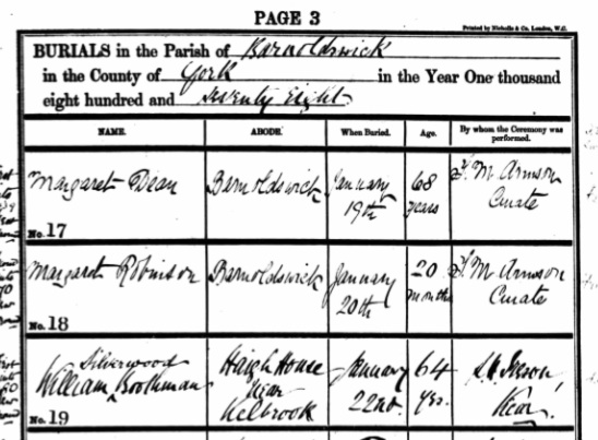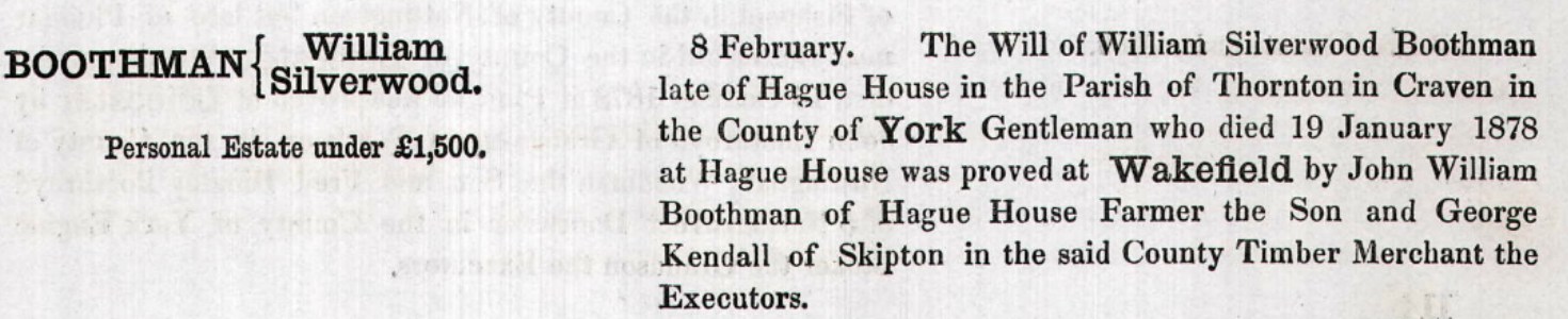 An entry from the National Probate Calendar (Index of Wills and Administrations) shows that William died at Hague House at the age of 65 on 19 January 1878. His only son, John William was joint executor. The designation of his occupation as ‘Farmer’ is odd though - perhaps an error. The death is confirmed by the record from the Barnoldswick Burials Register 1878 showing that William Silverwood was buried on 22 January 1878.