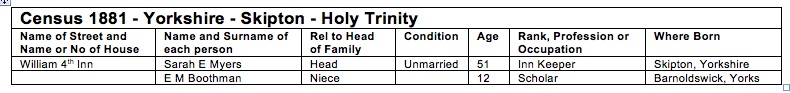 Elizabeth who would now be 12 years of age is missing from Hague House. She is staying with her aunt (Rachel’s sister) Sarah E Myers who is Inn Keeper at the William IV Inn in Skipton (see Myers line). It appears that Sarah took over this pub after the death of her father Wilkinson Myers in 1871. Wilkinson had been innkeeper there at least since 1841. I cannot find Sarah her anywhere in 1891 but she was presumably still at the William IV as there is apparently an indenture dated 1897 when Sarah sold the inn (see Myers line).