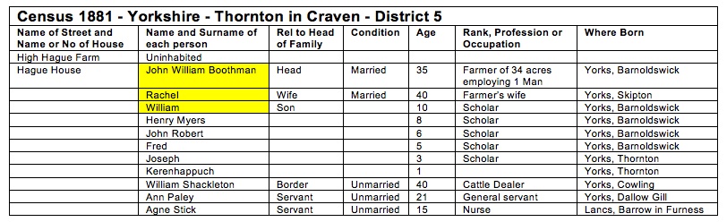 In 1881 John & Rachel and their family were still living at Hague House, Thornton in Craven. The adjacent property is the uninhabited High Hague Farm. Rachel’s age seems to have jumped up a year or two - perhaps she just felt this old having had so many children!!!
