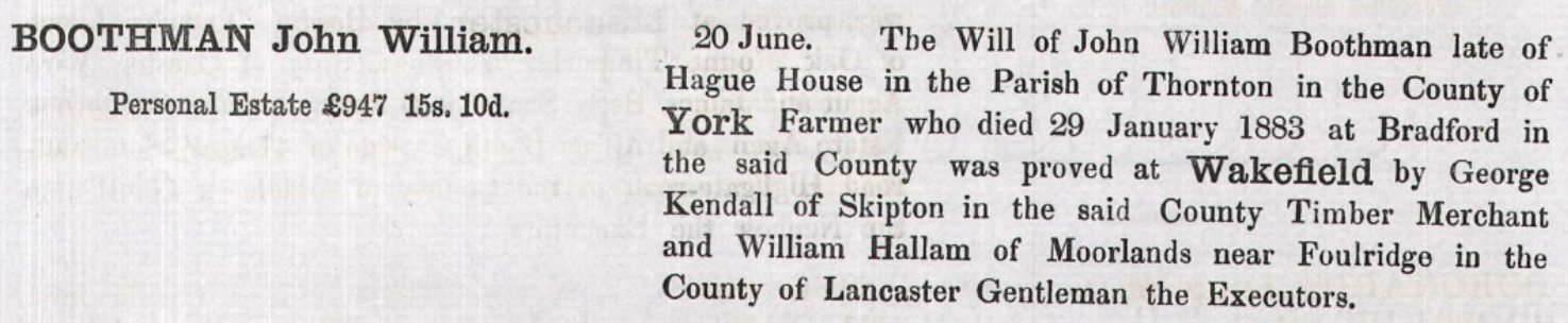 It seems quite likely that the Boothmans - John William & Rachel and children and also grandparents William Silverwood & Betty - moved into Hague House as soon as the lease was released in 1876. The births of the children (see p 12) show that John William & Rachel were not there in January 1876 when Fred was born but they were there in October 1876 when Betty died and for the birth of their next child Joseph in December 1877.