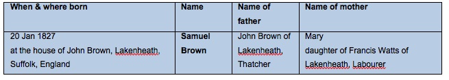The best fit for Samuel Brown’s birth is in Lakenheath, Suffolk which is about 25 miles from Needham Market (given as his birthplace on the 1961 census - see above). The document available via Ancestry from England & Wales, Non-Conformist and Non-Parochial Registers, 1567-1970 is very rich in detail - as good as a birth certificate - and gives Samuel's parents' names as John Brown and Mary (nee Watts). John signed the certificate but Mary made her mark (ie was illiterate).