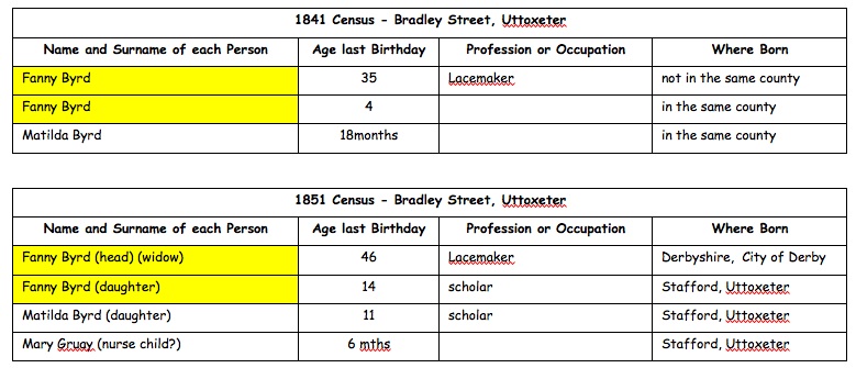 The 1841 and 1851 census for Fanny Byrd (junior) support the idea that