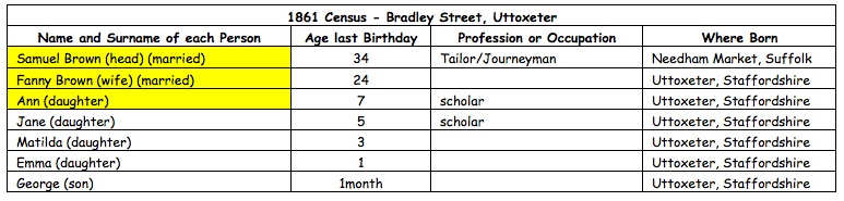 Brown continue to live in Bradley Street in 1871 and 1881 and are in Burton