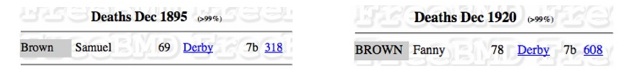 A widowed Fanny Brown (aged 64) is head of household in Derby in 1901, and in 1911 (aged 74) she is living with her daughter Matilda (now married to George James) at 37 Douglas Street Derby. This 1920 death (above) is the best fit although the age is not right - she would have been 83.