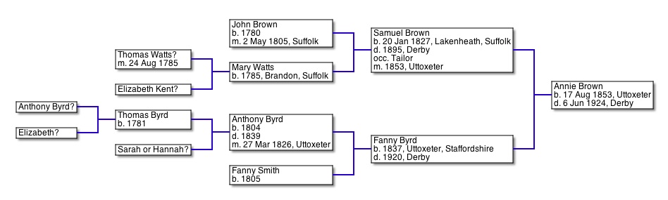 On the 1891 census Annie’s place of birth is given as Uttoxeter, Staffordshire.