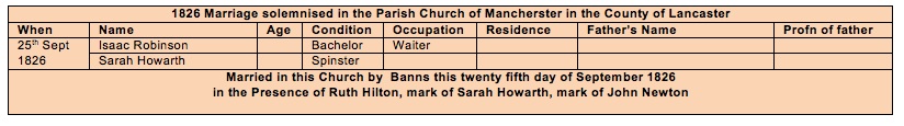 However, there appear to be at least 6 possible marriages for John and Mary - I do not know how K had determined that the wife was Mary Kittchon. There are also numerous baptisms in the same church of children with parents Mary & John Robinson. These could be siblings to Isaac but I cannot authenticate any of them.The baptismal record for Edwin Green Robinson certainly has his parents as Isaac and Sarah and there is a marriage record for Isaac Robinson and Sarah Howarth, which seems to be the best fit. The fact that Edwin was staying with a Howarth family in 1851 is another clue - although he is classed as a ‘visitor’, which does not help establish the relationship. The family tree above seems to suggest a fair bit of intermarriage between the Howarths and the Robinsons.