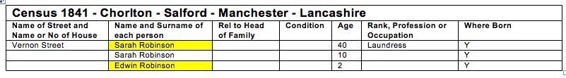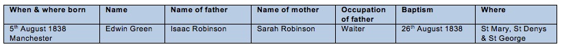 By the 1841 census Edwin’s ‘father’, Isaac, had died and the 2 year-old Edwin was living with his mother and sister in Salford.