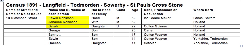 There is no sign of Edwin in the 1861 or 1871 census. This is entirely consistent with what I have been told - that as an esteemed engineer for the cotton industry Edwin went to work in Holland where he met and married a Dutch girl, Johanna Belt. The first four of their children, Sarah (Edrica), Sandy (Sander), George (Gerabus) and Ben (Barand) were born in Holland (and originally had those Dutch names) but the family returned to England and settled in Todmorden (Richmond Street) where Edwin and Hannah were born.