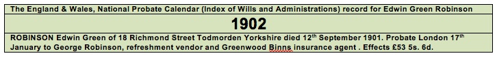 The England & Wales, National Probate Calendar (Index of Wills and Administrations) record for Edwin Green Robinson gives the date of death and shows probate granted to Edwin’s son George on 17th January 1902.