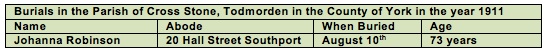 Johanna died a decade later in 1911 at the age of 73. She was buried with her husband at Cross Stone on 10th August 1911 (the death is registered in the September quarter).