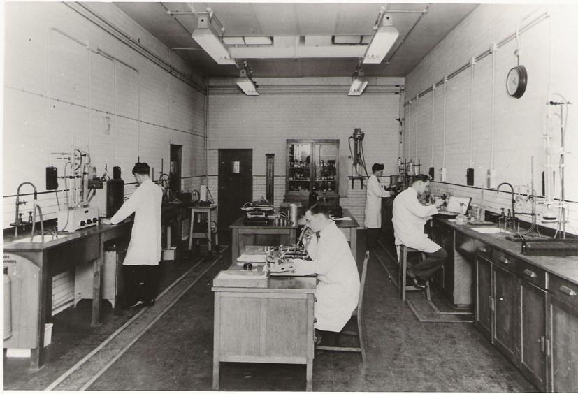 The only chemical analysis lab at Ferodo at that time was the Works Laboratory. They had not had anyone capable of taking a complex product such as a break-lining and analysing it chemically but my work at Rolls Royce plus the content of my degree had given me the skills and experience to tackle complex analysis. On the strength of this it was decided that the research department would encompass chemical research and, in order to accommodate this, a new research and development lab was built as a wing on the existing building.The photograph shows this lab with me on the right and Eric Whittaker in the centre. Some years later a whole new research block was built, mainly to give a much larger space for machine testing.