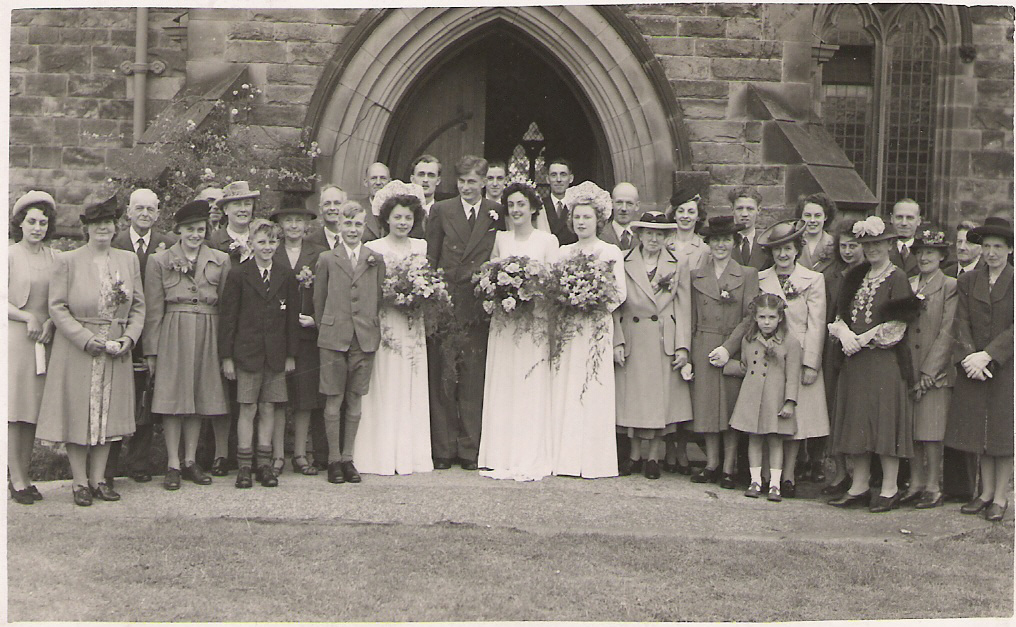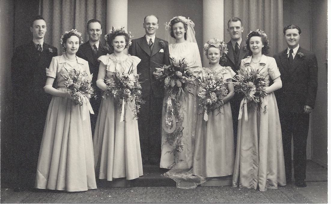 Dave is standing behind the bridegroom on the left and Muriel is in the back row just to the right of the church doorway wearing a pork-pie hat. John Swinburn is next to the bridesmaid on the left with Tom, behind his right shoulder and Margaret May is behind the right shoulder of the other boy, Robert Domleo.