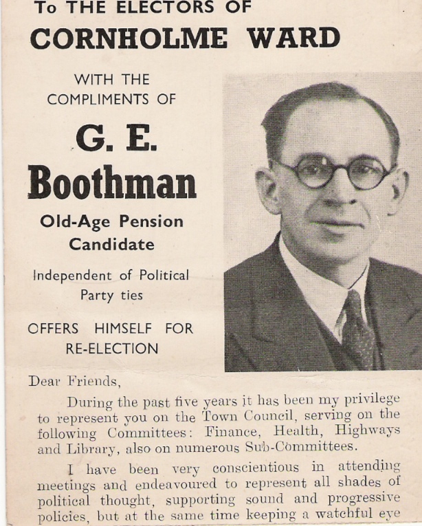 Todmorden Town Councillor for the Cornholme Ward. Although I had prepared an election address, in the event no-one